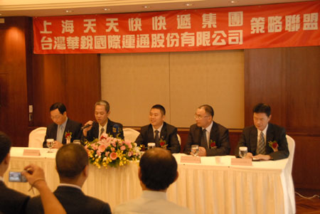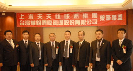 7月22日,上海天天快遞有限公司(天天快遞總部)與臺灣華銳國際運通股份有限公司策略聯盟簽約儀式在臺北舉行。天天快遞總部副董事長詹際煒、董事詹際恒、國際部執行董事劉三洋等高層管理人員代表天天快遞出席簽約儀式。此次天天快遞與臺灣華銳國際運通開展業務合作,是天天快遞進一步拓展海外市場,打造國際性知名快遞品牌的重要舉措。