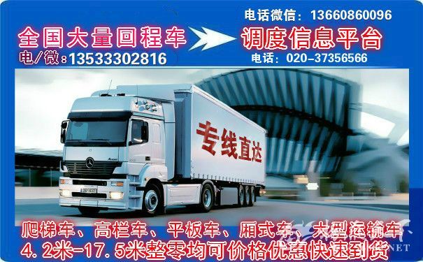 深圳到重慶回程車物流整車運(yùn)輸大件運(yùn)輸配貨物流專線公司全國各地大量回程車調(diào)度網(wǎng)絡(luò)信息平臺3.8米-17.5米整車大件運(yùn)輸危險品運(yùn)輸、價格優(yōu)惠快速到貨網(wǎng)全國定位跟蹤系統(tǒng),全國網(wǎng)點(diǎn)請撥打總機(jī)為你服務(wù):020-37356566、手機(jī)13533302816-13660860096(電話微信同步)低價運(yùn)輸、公司另有專業(yè)調(diào)車人員、可配全國各地整車零擔(dān)大件運(yùn)輸危險品運(yùn)輸調(diào)度車輛。