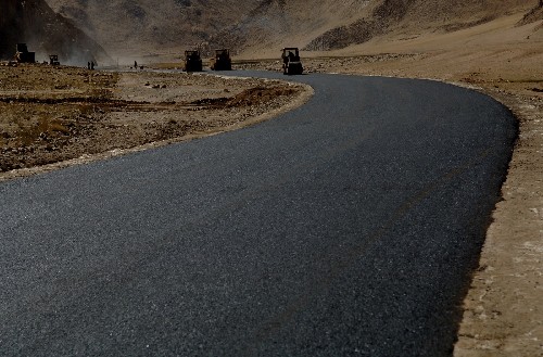 修路工人在鋪設(shè)西藏獅泉河至日土段公路(9月18日攝)。 新華社記者 索朗羅布 攝