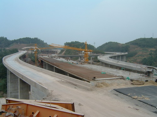 巖互通立交橋互通區(qū)由八座大小不等的橋梁組成,共有橋墩四十五個,橋面單幅長1.7千米,主線橋墩最高四十米,上面構(gòu)造為箱梁結(jié)構(gòu),每一跨箱體重達七百到八百噸。由于地質(zhì)情況復(fù)雜,施工難度相當大,樁基開挖深度最深達52米。據(jù)了解,該橋總投資七千多萬元,2004年10月開始施工。