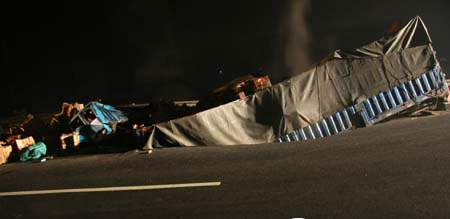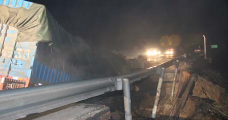 旁邊的村民說,是橫穿高速公路路基下得自來水管道破裂大量出水才導致高速公路得路基被沖塌,路面上露出了大洞。正在說的時候,又聽見坑洞里面傳來路基的沙石被水的沖洗倒塌的嘩嘩聲。村民還說,當坑洞形成的時候,他們那站在路肩上向過來的車輛揮手,讓他們停車,可是還是來不及,眼睜睜的看到這個掛著金華牌照的貨車沖到了坑洞里。