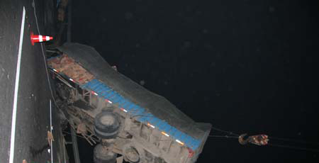 現場其他車輛全部撤除以后,施救單位的吊車到達現場并停在警戒線以外,把吊臂伸到了該車的上方一點一點的把車吊出。