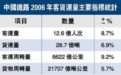 【大公報(bào)訊】中國(guó)鐵路客貨運(yùn)量在連續(xù)三年大幅增長(zhǎng)的高起點(diǎn)上再創(chuàng)歷史新高。2006年鐵路共發(fā)送旅客12.6億人次,同比增加1億人次,增長(zhǎng)8.7%;貨物發(fā)送量完成28.7億噸,同比增加1.9億噸,增長(zhǎng)6.9%。