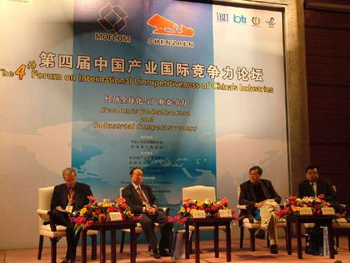 圖:中國(guó)物流與采購(gòu)聯(lián)合會(huì)副會(huì)長(zhǎng)丁俊發(fā)(左二)談跨國(guó)物企的中國(guó)戰(zhàn)略給中國(guó)物流產(chǎn)業(yè)帶來的挑戰(zhàn)