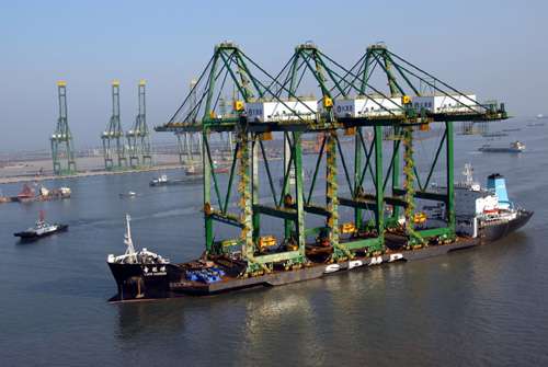 圖:天津東疆保稅港區第三批集裝箱岸吊搭乘巴拿馬籍“幸運港”號特種運輸船舶由上海運抵天津港,為東疆保稅港區年底實現首期封關運作奠定了基礎。