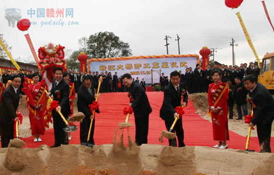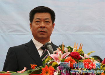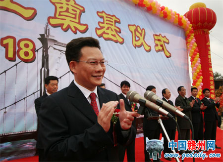 蔡曉明在儀式上致詞。他說,在全市上下認真學習貫徹黨的十七大精神,以更加昂揚的斗志加快贛州改革開放和現(xiàn)代化建設的日子里,我們迎來了期盼已久的贛江源頭第一橋——贛江大橋的正式開工,這是贛州交通建設史上的一件大事、喜事。贛江大橋為城市景觀橋,是贛州主城區(qū)連接水東、水西兩個城市片區(qū),形成贛州中心城區(qū)內(nèi)外連通的外環(huán)快速通道的樞紐工程,也是我市擴大對外開放的窗口工程。贛江大橋的開工建設,是落實市委、市政府“對接長珠閩,建設新贛州”發(fā)展戰(zhàn)略,把贛州建設成為區(qū)域性現(xiàn)代化中心城市的重要舉措,是完善城市交通網(wǎng)絡、形成立體化大交通格局的重要一環(huán),是拉開城市框架、增強集聚輻射能力、提升城市形象、彰顯城市魅力的重要途徑,對我市進一步打造對接平臺,完善城市功能,優(yōu)化發(fā)展環(huán)境,加快中心城區(qū)現(xiàn)代化建設,推進城市化進程,實現(xiàn)贛州經(jīng)濟社會又好又快發(fā)展,必將產(chǎn)生積極而深遠的影響。