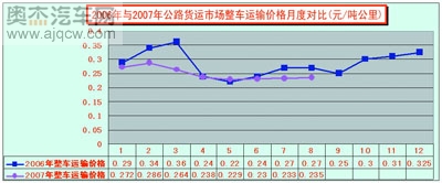 2007年零擔重貨價格也是同樣的走勢,僅有3月價格水平高于2006年同期水平,其他月份均出現較低價位。2006年零擔重貨運輸平均價格為0.42125元/噸公里,2007年平均價格為0.3631元/噸公里,下降幅度達到13.8%。