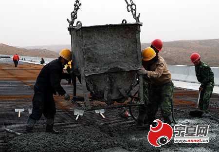 昨天,橋梁工人在鹽中高速公路雙陰溝大橋上緊張地進行水泥混凝土澆筑。雙陰溝大橋地處中寧縣恩和鄉境內,大橋長546米,最高橋墩達到21米以上,是鹽中高速公路上跨度最大、高度最高的工程之一。