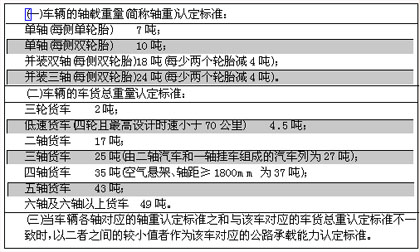 根據(jù)國家質量監(jiān)督檢驗檢疫總局、國家標準化委員會發(fā)布的《道路車輛外廓尺寸、軸荷及質量限值》(GB1589—2004)國家標準,確定公路承載能力的認定標準如下: