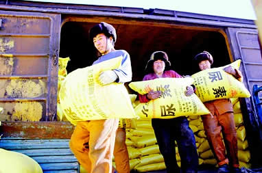 工人正在裝卸物資。本報記者 宋 澍 攝