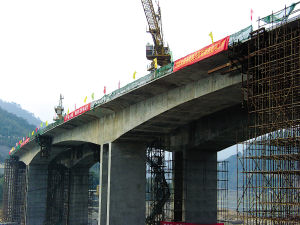 常坑大橋從2005年10月開始建設(shè),在施工過程中,施工單位始終把質(zhì)量放在首位,牢固樹立“安全第一”的思想,克服了資金困難、人員緊張、洪澇災(zāi)害等種種困難,科學(xué)組織施工、優(yōu)化資源配置、加大設(shè)備投入、加強事務(wù)協(xié)調(diào)。為確保施工目標(biāo)的順利實現(xiàn),施工單位增加掛籃進行左右幅同時施工,以加快施工進度,終于比業(yè)主制定的節(jié)點目標(biāo)提前兩個月完成施工任務(wù)。