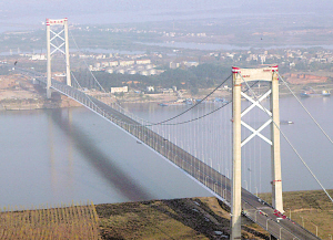 大橋位于武漢東北郊,主跨1280米,一跨過江,為世界第八大、國(guó)內(nèi)第三大懸索橋。大橋建設(shè)總投資約20億元。