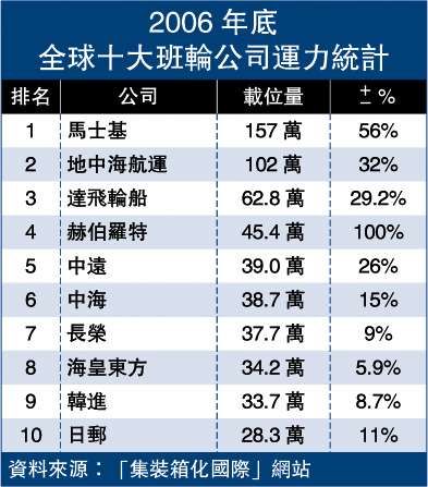 【大公報訊】英國“集裝箱化國際”雜志網(wǎng)站剛公布2006年班輪航運公司的業(yè)務表現(xiàn),去年全球班輪運輸公司運力增加了14%,是近六年來增幅最快的一年。