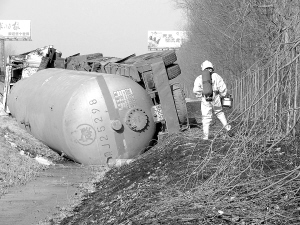 人民網·天津視窗2月12日訊:運載危險品的罐式貨車沖下高速公路,公安、消防、安監等部門在現場監護了約16個小時,才將險情徹底排除。