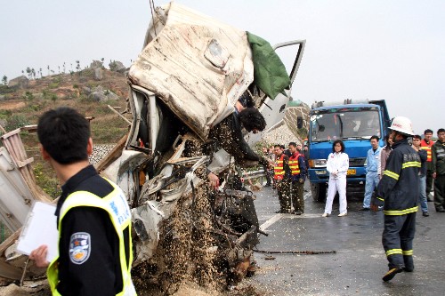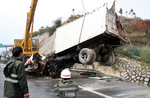 2月25日,救援人員在事故現場清理追尾車輛。當日6時許,福州至廈門高速公路上發生一起車禍,一輛從湖北宜昌開往福建石獅的大客車與一輛小貨車發生追尾,導致4人死亡2人受傷。 新華社發