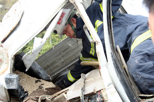 2月25日,消防隊員在車禍事故現場施救。新華社發