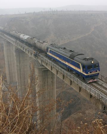 2月8日,一列貨物列車通過西(安)延(安)鐵路蟠桃溝大橋。當(dāng)日上午,經(jīng)過鐵路部門有關(guān)人員的日夜緊急搶修,因蟠桃溝大橋橋梁出現(xiàn)線路故障而停運(yùn)的西安至延安鐵路恢復(fù)運(yùn)行。