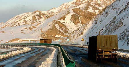 3月7日,兩輛貨車通過已經恢復通車的北京至拉薩高速公路烏海段。當日,受降雪天氣影響封閉的北京至拉薩高速公路(110高速)內蒙古段全線恢復通車。