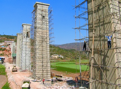 泛亞鐵路重要組成部分的玉蒙鐵路自開工建設以來進展順利。目前,通海境內全長300多米的漢邑大橋基礎工程已經完工,只待隧道打通后架設橋梁。圖為施工人員在拆除腳手架,并對橋墩進行打磨。