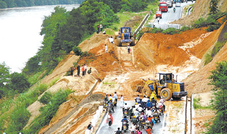 6月10日上午,位于會昌縣珠蘭鄉的一條公路被近5000立方米的滑坡泥石攔腰截斷。經過該縣公路、交通等部門的全力搶修,至當日下午4時,該路段交通部分恢復。肖良 攝