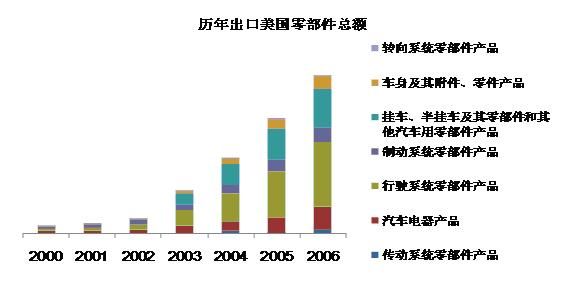 從2003年開始,出口到美國的零部件總額飛速增長。到2006年,出口到美國的零部件總量達(dá)到了69億美元,其中出口增長較快的是行駛系統(tǒng)零部件產(chǎn)品和轉(zhuǎn)向系統(tǒng)的零部件產(chǎn)品。圖2