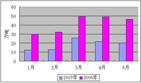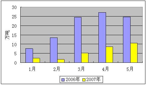 下圖顯示了2006年和2007年前5個月進口棉花數量情況對比。