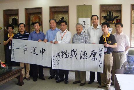 錢永昌先生(右四)為申通題詞“厚德載物”,保育鈞先生(左四)題詞“申通第一”,吳斌先生(右五)、徐勇先生(左二)和陳向陽先生(右二)代表我司接受了題詞