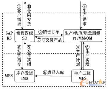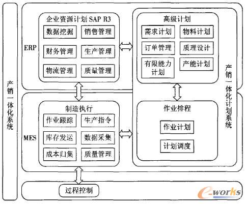 在該架構(gòu)下,ERP系統(tǒng)和MES制造執(zhí)行模塊之間,MES與過(guò)程控制系統(tǒng)之間通過(guò)實(shí)時(shí)有效的信息交互來(lái)保證產(chǎn)銷之間信息的溝通與銜接,而由ERP的高級(jí)計(jì)劃系統(tǒng)和MES的作業(yè)排程模塊共同構(gòu)成的產(chǎn)銷一體化計(jì)劃系統(tǒng)可保證ERP與MES之間計(jì)劃的銜接與協(xié)調(diào)。另外,還可通過(guò)ERP系統(tǒng)的質(zhì)量管理功能、高級(jí)計(jì)劃中的質(zhì)量設(shè)計(jì)功能以及MES的質(zhì)量管理功能的有效集成實(shí)現(xiàn)面向過(guò)程的全面質(zhì)量管理體系,在整個(gè)產(chǎn)銷過(guò)程中對(duì)產(chǎn)品質(zhì)量進(jìn)行有效控制和跟蹤。