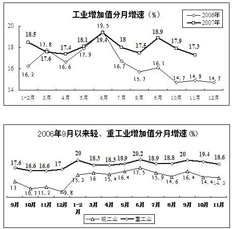 工業生產增速繼續有所放緩。11月份,規模以上工業企業增加值同比增長17.3%,增速比上月減緩0.6個百分點,同比加快2.4個百分點。其中,輕、重工業分別增長14.3%和18.6%,比上月減緩0.1和0.8個百分點。