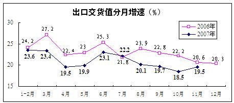 工業品出口交貨值增速比上月略有回升。11月份,規模以上工業企業出口交貨值6572億元,同比增長19.5%,增速比上月加快1個百分點,同比減緩1.1個百分點。1-11月,出口交貨值65723億元,增長21.4%,同比減緩1.9個百分點。