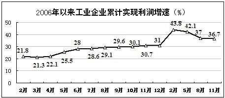 經濟效益水平繼續提高。前11個月,工業企業經濟效益綜合指數為209.92,同比提高21.6點。實現利潤22951億元,同比增加6418億元,增長36.7%,增幅同比提高6個百分點,比1-8月回落0.3個百分點。虧損企業虧損額1717億元,同比下降17.3%(去年同期為上升15.7%)。國有及國有控股工業企業實現利潤9661億元,增長30%,提高6.1個百分點。