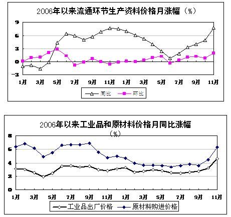 生產資料價格漲幅繼續提高。11月份,流通環節生產資料市場價格環比上漲2%;同比上漲7.7%,漲幅比上月提高2.8個百分點。工業品出廠價格同比上漲4.6%,比上月提高1.4個百分點;原材料、燃料、動力價格上漲6.3%,提高1.8個百分點。