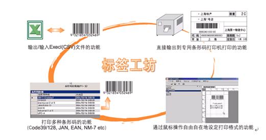 “標簽打印系統”可直接輸入數據生成CODE39/128、JAN(8/13位)、EAN(8/13位)、NM-7等各種條碼。另外,通過數據庫軟件導入CSV形式的數據,并可自動轉換成條碼進行導出,實現數據庫的管理。