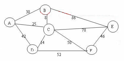 2.有一批貨物要從A地運往B、C、D、E、F各地,它們之間的距離如下圖,圖中直線上的數(shù)據(jù)表示相應(yīng)的行車距離(單位:公里)。請采用單一路徑方法求出A地到其它各地的最短運輸路線及其相應(yīng)的公里數(shù)。