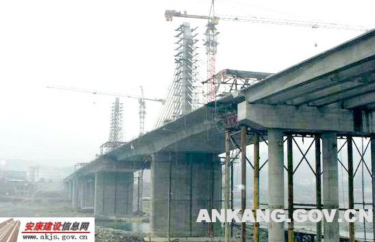 安康七里溝漢江大橋南接環城干道江南段,北接安康大道,距漢江一橋1.76公里,全長1100米,總投資1.6億元,為我省第一座預應力鋼筋砼矮塔斜拉橋。