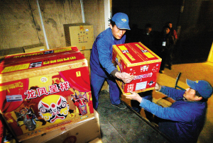 今天零時,滿載煙花爆竹的貼有“熊貓煙花”標識的危險貨物運輸專用車輛及統一著裝的熊貓煙花工作人員從北京市熊貓煙花有限公司位于房山區韓村河鎮的倉庫發車,正式開始了北京市五環路內煙花爆竹零售網點的配送,標志著2008年北京市五環路內的煙花爆竹銷售工作進入最后準備階段。