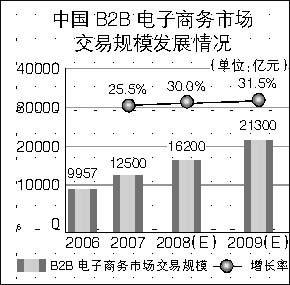 商務部昨日公布的數據顯示,2007年我國B2B電子商務交易增長超過25%,交易規模達到12500億元人民幣。 分析發現,來自能源、化工、制造、流通等領域的大型行業企業的深度介入,是其市場規模大幅增長的核心動力。 中國互聯網協會數據中心的調查報告預計,未來兩年中國B2B電子商務規模將繼續高速增長,2008年將達到約16200億元,2009年突破21000億元。