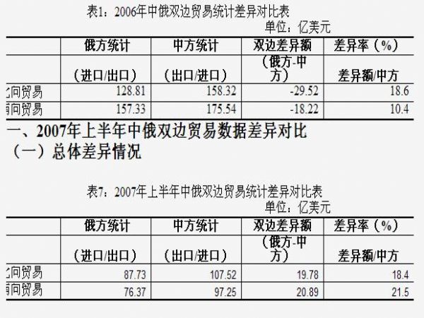 2006年北向貿(mào)易(即中方出口/俄方進口)中,據(jù)俄方統(tǒng)計,俄羅斯自中國進口128.81億美元,而中方統(tǒng)計對俄出口達158.32億美元,雙邊貿(mào)易統(tǒng)計負差異高達29.52億美元,相當于中方統(tǒng)計出口值的18.6%。而南向貿(mào)易(即中方進口/俄方出口)差異率相對較小,據(jù)俄方統(tǒng)計,俄羅斯對中國出口157.33億美元,中方統(tǒng)計自俄羅斯進口175.54億美元,雙邊貿(mào)易統(tǒng)計負差異18.22億美元,相當于中方統(tǒng)計進口的10.4%