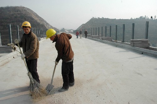 2月27日,工人在宜萬鐵路宜昌長江大橋上清掃,為鋪軌作準備。