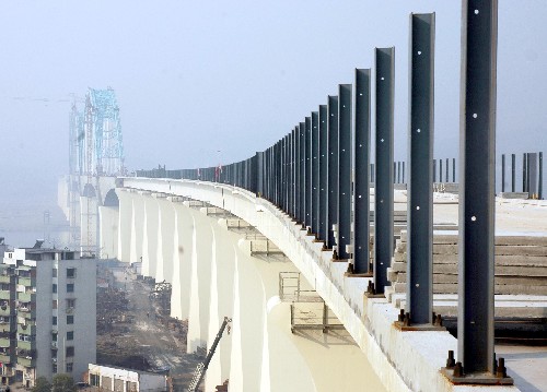 2月27日拍攝的宜萬鐵路宜昌長江大橋。 近日,宜(昌)萬(州)鐵路控制性工程--宜昌長江大橋的橋面施工全部結束,引橋護欄施工接近尾聲,大橋已具備鋪軌條件。