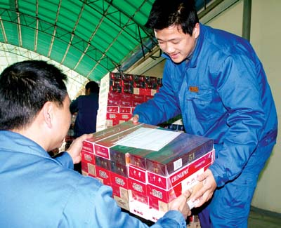 送貨員正往車上搬運(yùn)分揀好的卷煙。
