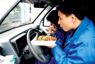 為了及時(shí)將卷煙送到零售客戶手中,送貨員經(jīng)常加班加點(diǎn)工作,午飯一般都在車上吃。