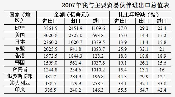 此外,2007年我對(duì)東盟、香港、韓國(guó)和臺(tái)灣省的雙邊貿(mào)易值均超過(guò)千億美元,分別為2025.5億美元、1972.5億美元、1599億美元和1244.8億美元,分別增長(zhǎng)25.9%、18.8%、19.1%和15.4%(下表)。