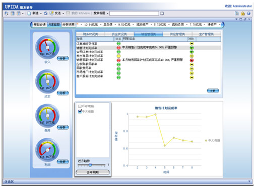 管理者可以通過瀏覽器的儀表盤欄的顯示,了解到有幾個指標處于“紅燈區(qū)”,該數(shù)據(jù)表明,業(yè)務(wù)已經(jīng)存在較大問題,這個月收入完成情況不是非常好。同時,在界面中的當(dāng)月月度收入考核指標中,可以事先定義收入考核指標(銷售計劃的完成率),就能直觀的了解該業(yè)務(wù)區(qū)是否達成業(yè)績目標。如果沒有完成,就會亮“紅燈”。管理者在界面中可以看到,這個月實際計劃完成率僅有64%,該指標相對于考核的目標來說,已經(jīng)位于嚴重預(yù)警區(qū)間。管理者可以通過對異常指標的追溯,了解一下近三個月以來,或者近十個月以來,總體的銷售趨勢如何。
