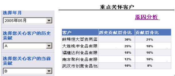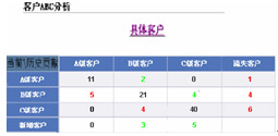 客戶的ABC分析的模型(客戶貢獻度深度挖掘的模型),管理者可以更深層次的進行經(jīng)營分析,可以在這個模型中看到更詳細的信息。系統(tǒng)支持依據(jù)客戶的業(yè)績貢獻進行客戶ABC分類。通過ABC模型,管理者發(fā)現(xiàn),原來的A級客戶有11家,但是在本月已經(jīng)有5家A類客戶降為B級客戶,顯然這是業(yè)績下降數(shù)字背后的一個因素。還可以更深層次的看當(dāng)期A類客戶的貢獻率,他們依據(jù)系統(tǒng)數(shù)據(jù)發(fā)現(xiàn)對業(yè)績貢獻最高的5家A級客戶,過去的歷史貢獻是30%,發(fā)現(xiàn)下滑,降為25%降,再從歷史數(shù)據(jù)分析,發(fā)現(xiàn)該客戶自4月以來,貢獻率一直持續(xù)往下滑。更深入的分析,我們還可以依托平臺了解到該客戶的客戶經(jīng)理是深圳分公司的叫李良的業(yè)務(wù)員,顯然,這是導(dǎo)致本期業(yè)績下滑表象背后的深層次問題之一。