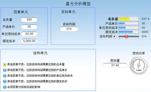 這個模型在大多數(shù)情況下,用于產(chǎn)品的定價。但是在用友企業(yè)經(jīng)營管理平臺中,我們可以把盈虧平衡分析更深入的應(yīng)用到經(jīng)營管理中來,可以通過該模型對多個產(chǎn)品的結(jié)構(gòu)進行組合,并且根據(jù)歷史經(jīng)營數(shù)據(jù)的積累,實時了解該組合的利潤貢獻情況,從中確定較佳的產(chǎn)品組合。例如:管理者可以從就一個產(chǎn)品進行模擬,了解其符合其利潤目標的最佳生產(chǎn)量。這時候可以進行更進一步的分析,了解當(dāng)期產(chǎn)能負載是否可以支持在未來時期內(nèi)的生產(chǎn);同樣,可以根據(jù)企業(yè)市場部的調(diào)研,以及銷售部的經(jīng)營能力,確定一個保證利潤目標的合理價格區(qū)間。該結(jié)果依托與系統(tǒng)提供的該產(chǎn)品的單位變動成本、固定成本數(shù)字,歷史成本和數(shù)據(jù)的提供,前面考慮多個影響因素提供準確的經(jīng)營參考數(shù)據(jù)。