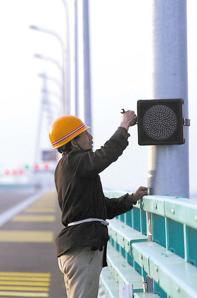 工人正在給大橋上的霧燈進(jìn)行最后調(diào)試。