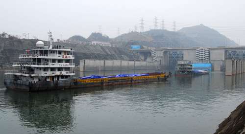 長江三峽水利樞紐雙線五級船閘在經(jīng)過近37小時的持續(xù)停航后,于17日恢復(fù)雙線通航,這是三峽船閘2003年6月建成通航后,因惡劣天氣停運時間最長的一次。兩艘貨輪開進三峽船閘六閘首北線船閘。