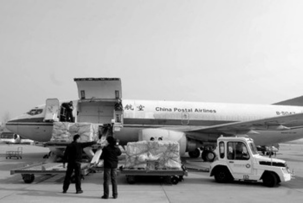 在煙臺(tái)國(guó)際機(jī)場(chǎng),工作人員正往中國(guó)貨運(yùn)郵政航空公司的郵政飛機(jī)上裝載貨物。 新華社發(fā)