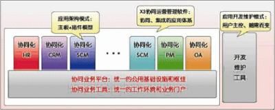 為企業(yè)信息系統(tǒng)建設(shè)提供了統(tǒng)一的公用基礎(chǔ)設(shè)施平臺(tái),X3協(xié)同業(yè)務(wù)平臺(tái)采用“主板+插件”的模式來構(gòu)建和擴(kuò)展業(yè)務(wù)系統(tǒng),各類業(yè)務(wù)系統(tǒng)直接構(gòu)架或連接到統(tǒng)一的協(xié)同業(yè)務(wù)平臺(tái)上,并以其為基礎(chǔ)和樞紐,將分散的企業(yè)應(yīng)用管理系統(tǒng)整合起來,形成一個(gè)有機(jī)的、緊密聯(lián)系的整體。